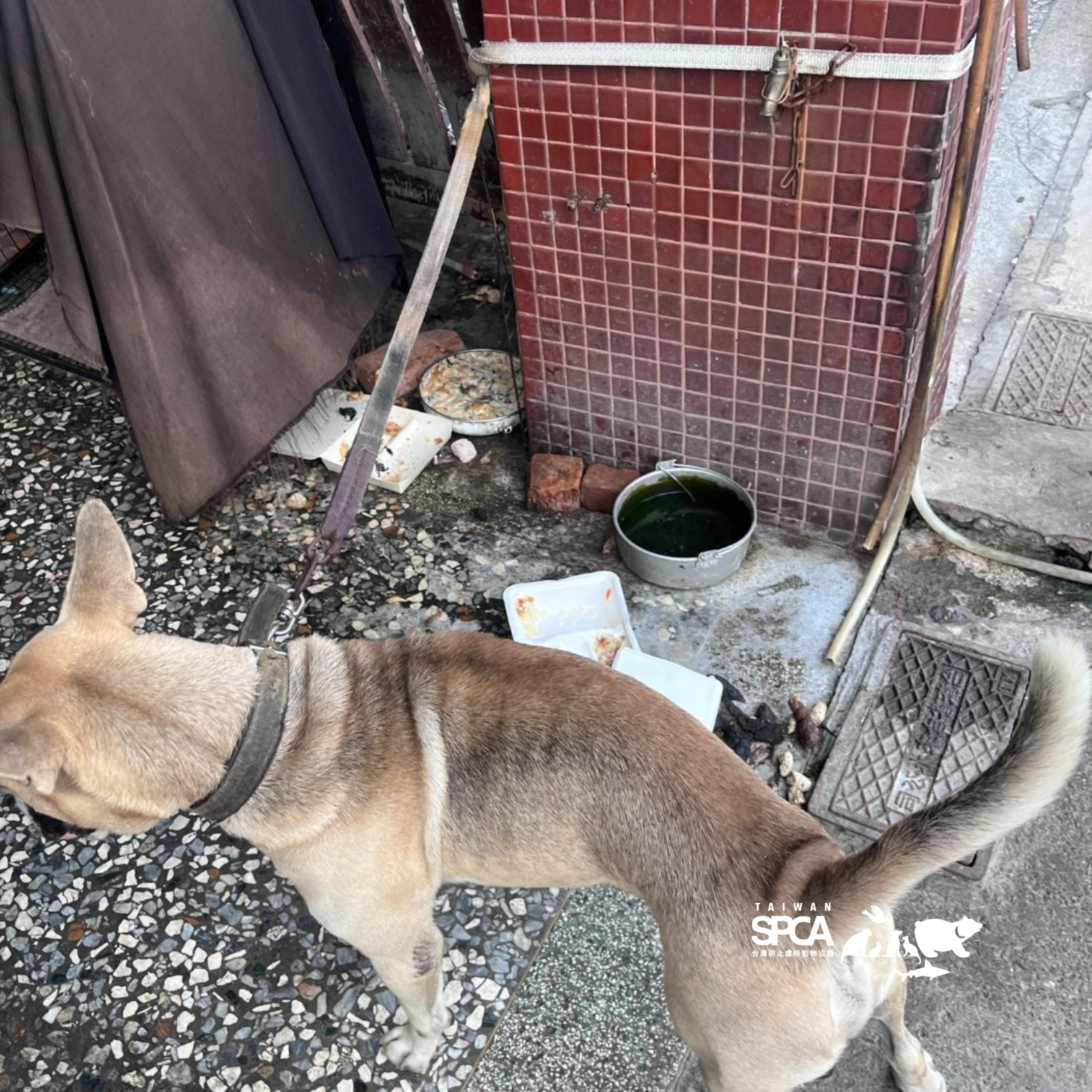 叮噹原本是家中小孩領養的狗狗,生活一度平穩而單純。但當孩子成家、準備搬離老家時,叮噹卻沒有在一起離開的名單裡。留下來的照顧者缺乏飼養觀念,也沒有照顧他的意願,叮噹就這樣被鏈在住家騎樓的一角。繩子不能加長,因為會踏進鄰居的範圍,於是吃飯、喝水、排泄、睡覺、發呆,全都只能在那個小小的正方形裡完成。