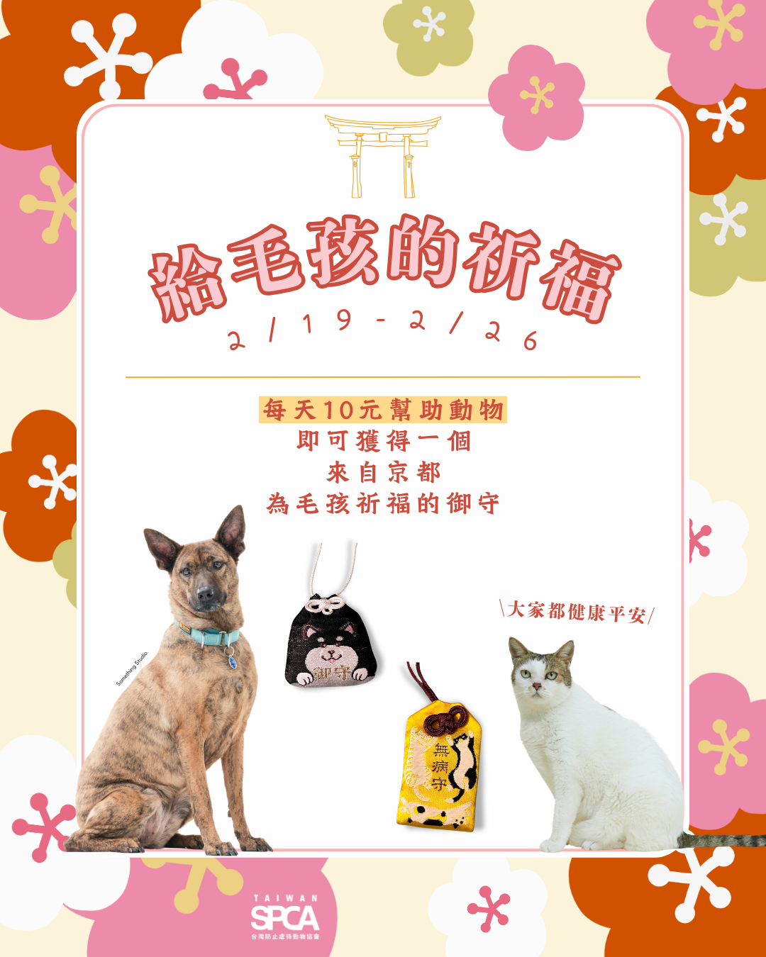 透過本募款專頁綁定至少每個月300元(=每天10元)的定期定額捐款訂單,綁定時長至少一年。您可於此募款專頁中選擇您想要的御守款式,綁定成功後我們將於年後工作日盡快將您的寵物御守寄至您捐款時所填寫指定的地址!僅有珍貴的50個名額,想響應要快喔!