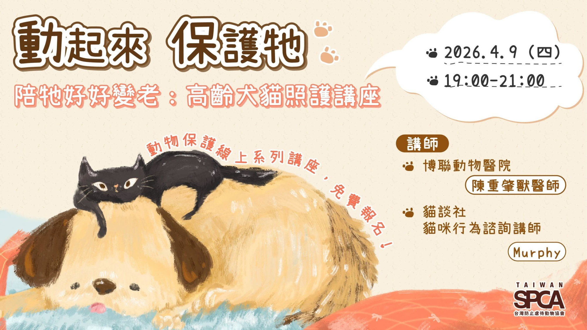 本場講座,TSPCA 特別邀請 陳重肇獸醫師 與 Murphy 貓行為咨詢師,從醫療與環境兩個面向出發,分享高齡犬貓常見的健康變化、照護重點,以及高齡貓在行為與生活環境上的需求,陪伴飼主更理解毛孩老去時真正需要的是什麼。